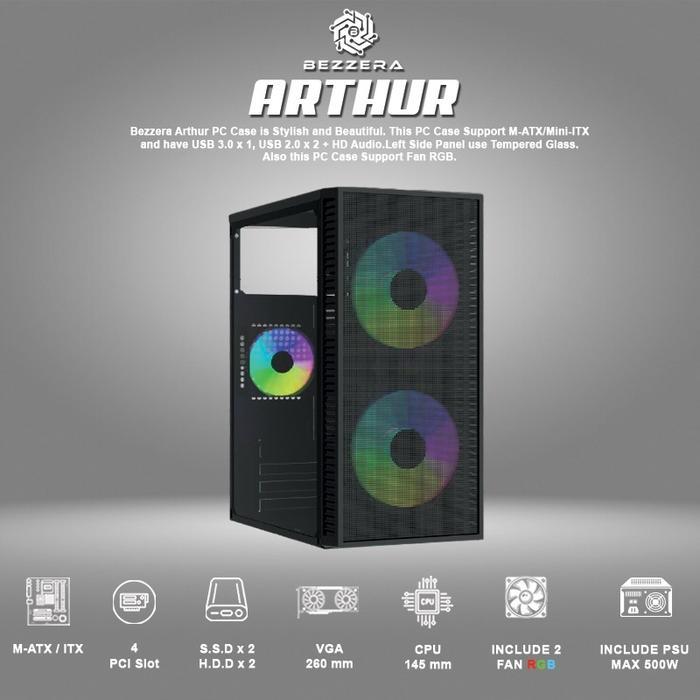 Casing Gaming BEZZERA ARTHUR – Tempered Glass | Include 2 RGB Fan | PSU 500WMinimalis, Stylish, dan Siap Tempur!