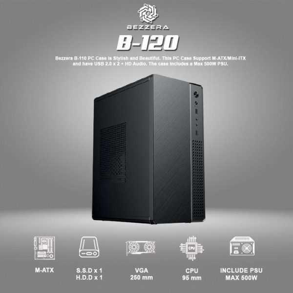 Casing PC Office Bezzera B-120 IncludeCasing PC Office Bezzera B-120 dilengkapi PSU 500W.Cocok untuk sistem M/ATX/ITX. Dimensi casing (L)295 x (W)175 x (H)350 mm.Panel I/O: 2x USB 2.0 + HD Audio. Buka ruang drive: 1x SSD ,1x HDD.Desain kompak, ideal untuk ruang terbatas. Cocok untuk pengguna yang membutuhkan casing yang efisien dan fungsional.Spesifikasi LengkapM/B Supported: M/ATX/ITXCase Size: (L)295 x (W)175 x (H)350 mmI/O Panel: 2 x USB 2.0 + HD AudioDrive Bays: 1x SSD ,1x HDDPCI Slots : 4VGA Max Length : 250 mmCPU Max Height : 96 mmPaket LengkapCasing ini termasuk PSU hingga 500W. Cocok untuk sistem dengan kebutuhan daya hingga 500W. Pastikan sistem Anda mendapatkan daya yang cukup. Cocok untuk pengguna yang membutuhkan casing yang efisien dan fungsional