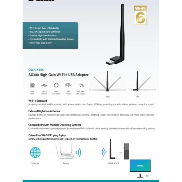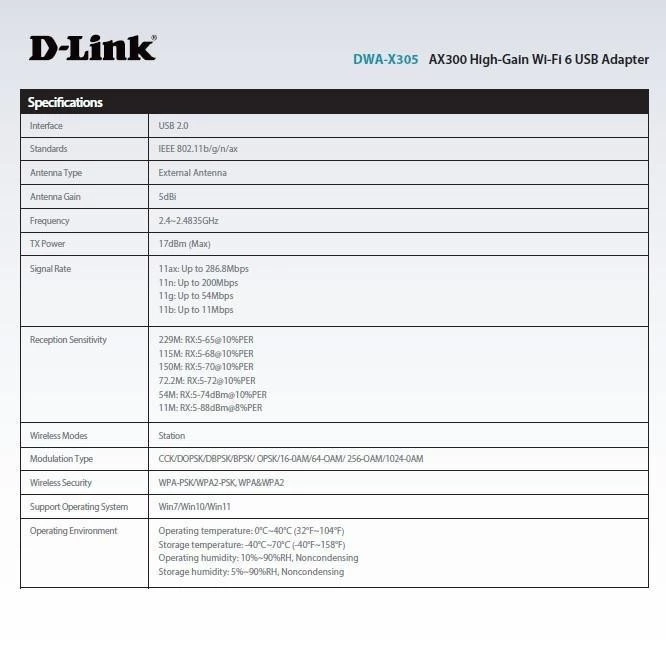D-Link DWA X305 Wireless AX300 WI-FI 6 High-Gain USB Adapter