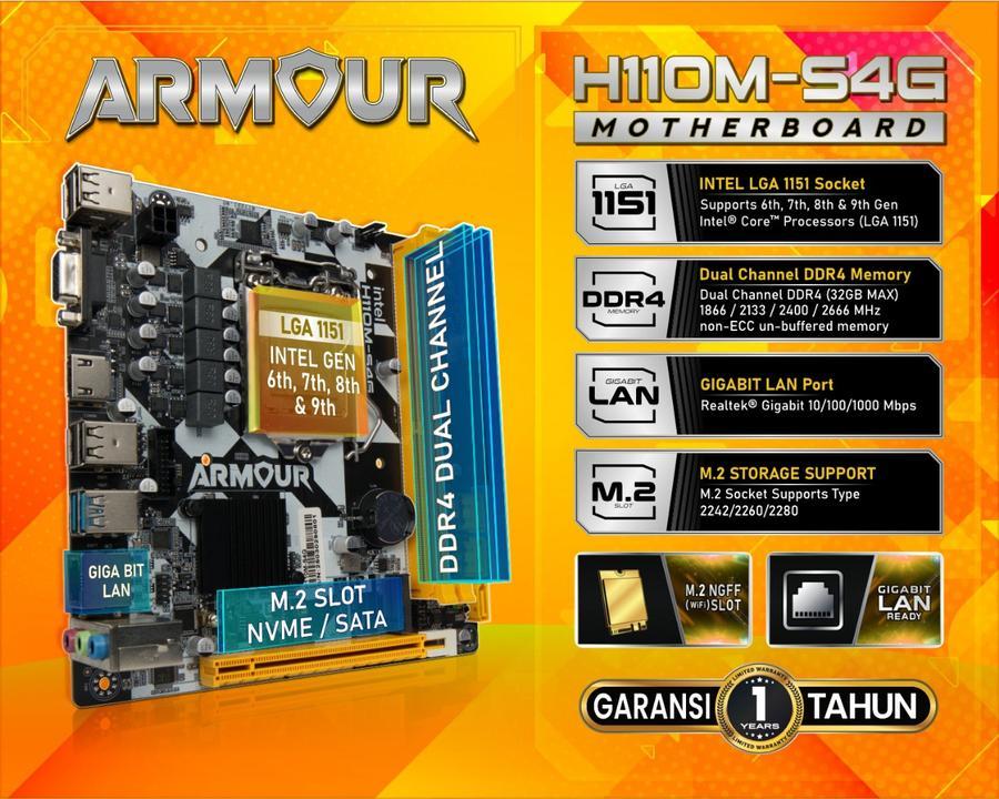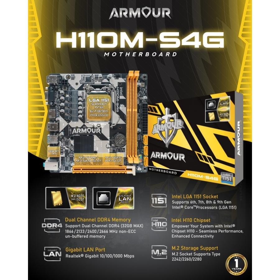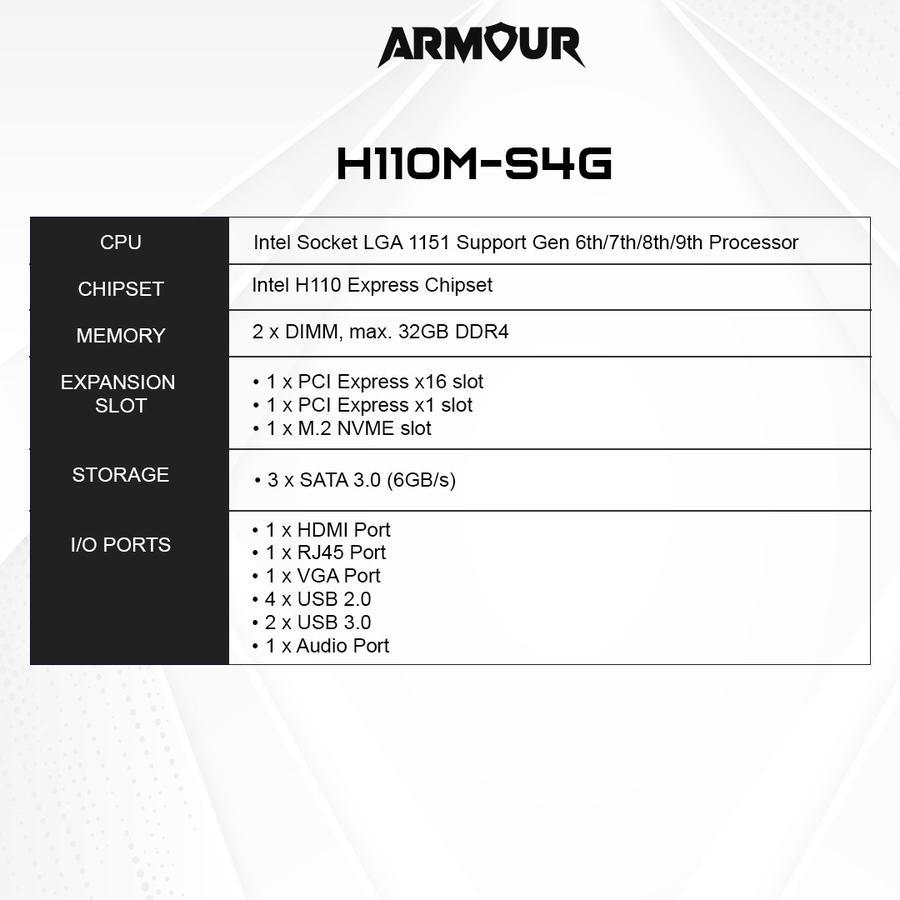 MOTHERBOARD ARMOUR H110M-S4G DDR4 INTEL H110 LGA 1151 GARANSI 1 TAHUN