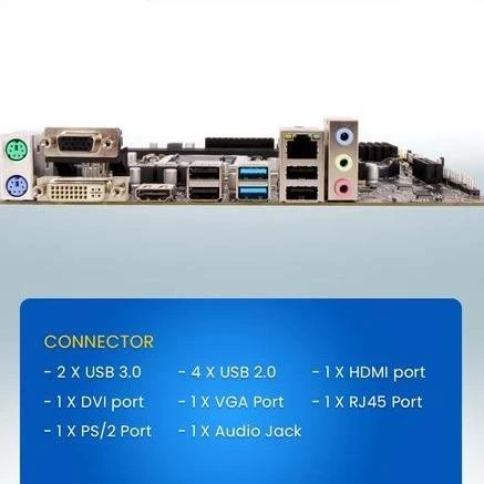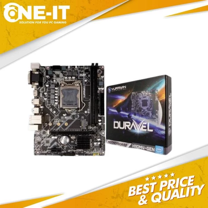 GARANSI RESMI BY VURRION GARANSI RESMI 2 TAHUN VURRION MOBO DURAVEL H110M4-GEN ◤CPU : Intel Socket LGA 1151 Core i7/i5/i3 For 6th / 7th / 8th / 9th Gen Intel Processors ◤Chipset : Intel B250 Express Chipset ◤Memory : 2X DIMM max. 32GB 2666 MHz DDR4 un-buffered ◤Expansion Slot : ◉ 1X PCI Express x16 slot ● 1X PCI Express x1 slot ● 1X M.2 NVME slot ◤Storage : ◉ 4X SATA 3.0 (6GB/s) ports ◤Form Factory : Micro-ATX Architecture ( 168 X 210mm ) ◩ On Board Interface Connector ◤ 1 X 24-Pin ATX Power ◤ 1 X F-Speaker ◤ 1 X 24-Pin ATX 12V Power ◤ 1 X Fan Power ◤ 1 X F-AUDIO ◤ 1 X F-PANEL ◩ Back Panel I/O Ports ◤ 2 X HDMI Port ◤ 1 X VGA Port ◤ 2 X DVI Port ◤ 2 X USB 3.0 ◤ 4 X USB 2.0 ◤ 1 X 3-in-1 Audio Port ◤ 1 X RJ45 Port ◤ 1 X PS/2 Jack ◩ Integrated Sound ◤ Realtek 6-channel ALC 662 HD Audio Codec onboard ◤ Provides front audio interface ◤ Provides front stereo mic interface