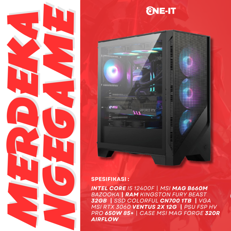 Spesifikasi Detail: Intel Core i5 12400F 2.5 GHz 6 Core 12 Threads Alder Lake LGA1700 Motherboard MSI MAG B660M BAZOOKA DDR4 1700 Intel B660 RAM Kingston Fury Beast 32GB Kit (2x16GB) 3200MHz DDR4 KF432C16BBK2/32 SSD COLORFUL CN700 1TB M.2 NVMe PCIe 4.0 VGA MSI RTX 3060 Ventus 2X 12G OC 12GB GDDR6 Power Supply / PSU FSP HV PRO 650W 85+ CASE MSI MAG FORGE 320R AIRFLOW Mid Tower ATX Chassis Bonus : FANTECH SHOOTER III WGP13S USB TYPE-C WIRELESS Gaming Gamepad Black