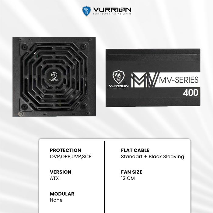 GARANSI RESMI BY VURRIONGARANSI RESMI 3 TAHUNMODEL MV SERIES 400Protection : OVP, OPP, UVP, SCP,Version : ATXModular : NoFlatcable : Standard + Black SleavingFan size : 12cmFITURE1x MB 24 Pin2x CPU 4+41x PCI-E 6+24x Sata2x PeripheralsVURRION TECHNOLOGY HAS NO LIMIT