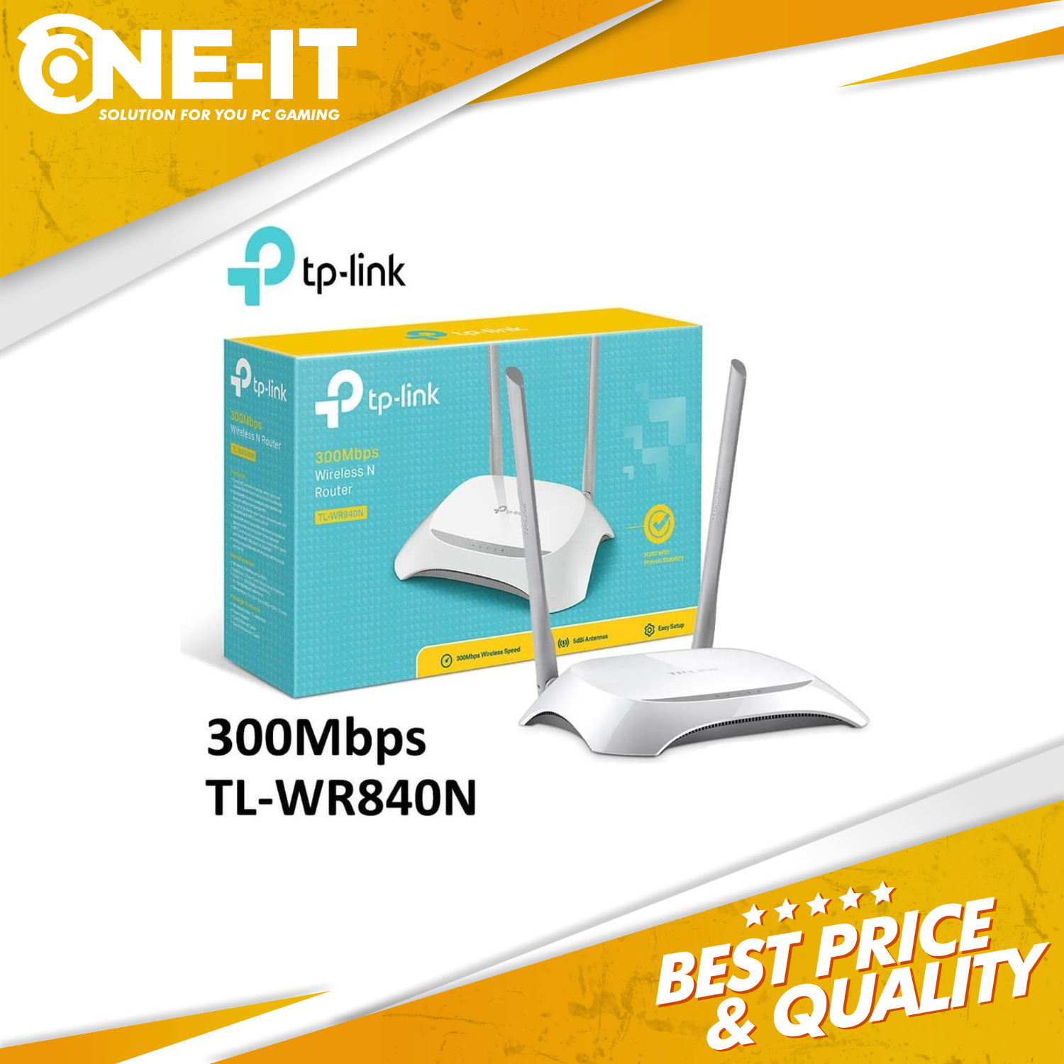 TP-Link TL-WR840N – Router Wireless N 300Mbps Stabil & HematTP-Link TL-WR840N adalah router WiFi 300Mbps yang ideal untuk rumah, kos, kantor kecil, dan warnet. Cocok untuk aktivitas harian seperti browsing, streaming, online meeting, dan gaming ringan dengan koneksi stabil dan pengaturan mudah.Fitur UtamaKecepatan WiFi hingga 300Mbps (Wireless N)2 Antena eksternal untuk jangkauan lebih luasTombol WPS – koneksi aman satu sentuhanIP-based Bandwidth Control – atur kecepatan tiap perangkatWDS Bridge – perluas jaringan wirelessMendukung IPv4 & IPv6Spesifikasi HardwareLAN Port: 4x 10/100MbpsWAN Port: 1x 10/100MbpsButton: WPS / ResetPower Adapter: 9V DC / 0.6AAntena: 2x Antena eksternalDimensi: 182 x 128 x 35 mmSpesifikasi WirelessFrekuensi: 2.4GHzStandar: IEEE 802.11b/g/nKecepatan:11n: up to 300Mbps11g: up to 54Mbps11b: up to 11MbpsKeamanan WiFi:WEP 64/128-bitWPA / WPA2WPA-PSK / WPA2-PSKFitur SoftwareQoS (WMM, Bandwidth Control)DHCP Server & ClientPort Forwarding, UPnP, DMZDynamic DNS (DynDNS, NO-IP, Comexe)VPN Pass-Through (PPTP, L2TP, IPSec)Parental Control & Access ControlSPI Firewall & DoS ProtectionGuest Network 2.4GHzIsi PaketTP-Link TL-WR840N Wireless RouterAdaptor PowerKabel LANQuick Installation GuideCocok UntukRumah & kosKantor kecil & tokoGaming ringan & streamingPengguna ISP Fiber / DSL / Modem