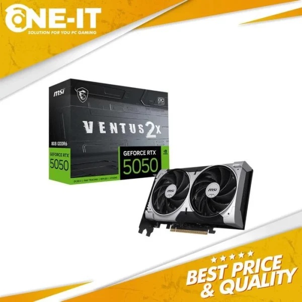 Extreme Performance: 2617 MHz (MSI Center)Boost: 2602 MHzMemory Speed 20 Gbps8GB GDDR6DisplayPort x 3 (v2.1b)HDMI x 1 (As specified in HDMI 2.1b: up to 4K 480Hz or 8K 120Hz with DSC, Gaming VRR, HDR)Powered by the NVIDIA Blackwell architecture and DLSS 4TORX Fan 5.0: Fan blades linked by ring arcs work to stabilize and maintain high-pressure airflowHeat pipe efficiently draws heat from the GPU, enhancing thermal transfer and cooling performanceReinforcing Backplate: Built-in vent allows direct exhaust airflow for better cooling efficiencyMSI Center: The exclusive MSI Center software lets you monitor, tweak and optimize MSI products in real-timeAfterburner software takes full control with the most recognized and widely used graphics card overclocking software in the worldDETAIL SPECIFICATIONProduct ConditionNewManufacturer Part #G5050-8V2CGPUNVIDIA GeForce RTX 5050Memory8GB GDDR6InterfacePCI Express Gen 5 x16 (uses x8)GPU ClockExtreme Performance: 2617 MHz (MSI Center)Boost: 2602 MHzMemory Clock20 GbpsCUDA2560 UnitsMemory Interface128-bitPower Headers8-pin x 1Min. Power Supply550 WPower Consumption130 WDVI Port-HDMI PortHDMI x 1 (As specified in HDMI 2.1b: up to 4K 480Hz or 8K 120Hz with DSC, Gaming VRR, HDR)USB-C-DisplayPortDisplayPort x 3 (v2.1b)Multi Display4DirectX12 UltimateOpenGLOpenGL 4.6VR READYYesMulti GPU Tech-DIGITAL MAXIMUM RESOLUTION7680 x 4320Afterburner SupportYesWeight1.08 lbsDimensions (WXDXH)7.76″ x 4.72″ x 3.26″Manufacturer Warranty3 Years