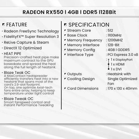 KETENTUAN GARANSI RESMI GARANSI 3 BULAN BILA DIGUNAKAN UNTUK MINNING / NAMBANG / CHISET DI FLASH GARANSI 2 TAHUN BILA DIGUNAKAN UNTUK GAMING / DESIGN / EDITING VIDEO Brand : Vurrion Type : RX 550 GPU : LEXA Stream Processor : 640 GPU Clock : 1183MHz Memory Clock : 6000 Mbps Memory Size : 4096 MB Memory Type : GDDR5 Memory Width : 128-Bit Output : DVI, HDMI, VGA Cooling System : Single FAN Warranty : 2 YearsVURRION TECHNOLOGY HAS NO LIMIT